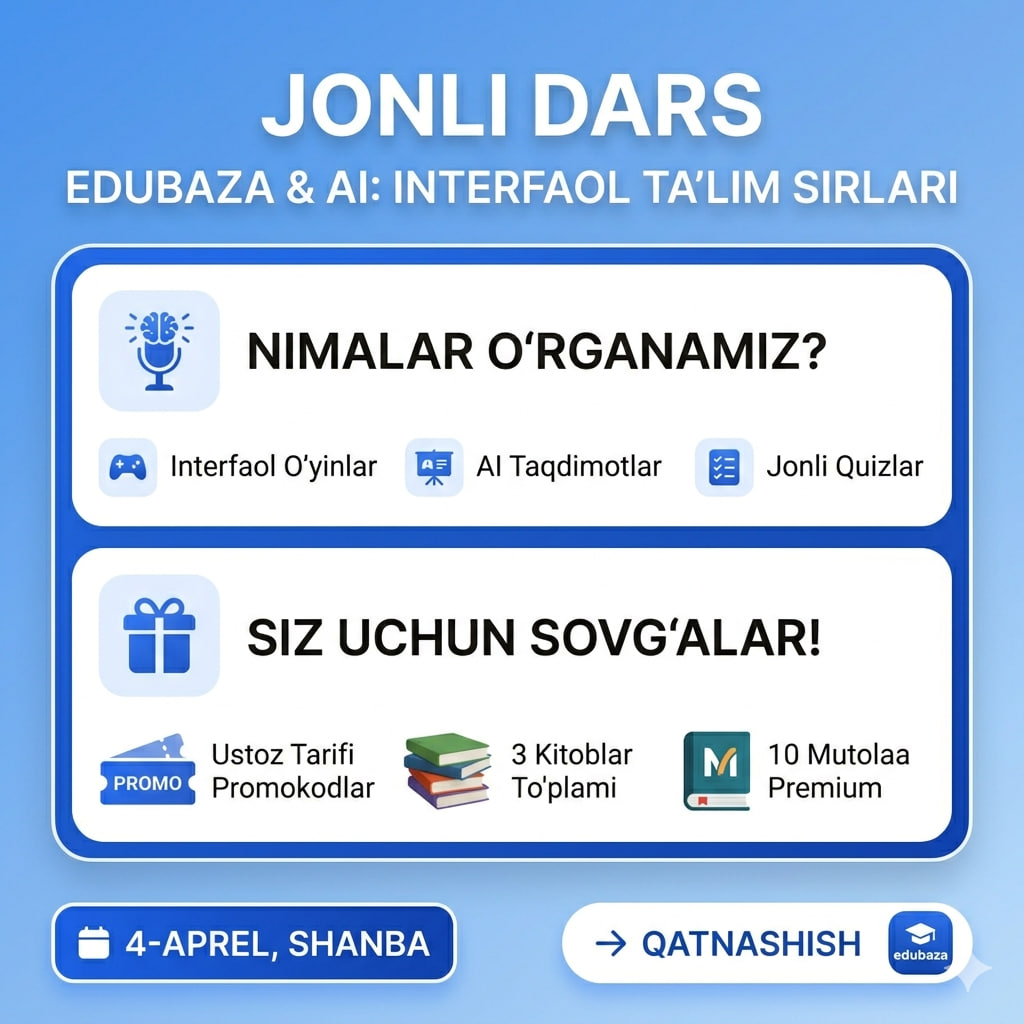 🎁 Qatnashgan barchaga Edubaza'ning "Ustoz" tarifi uchun maxsus promokodlar taqdim etiladi.