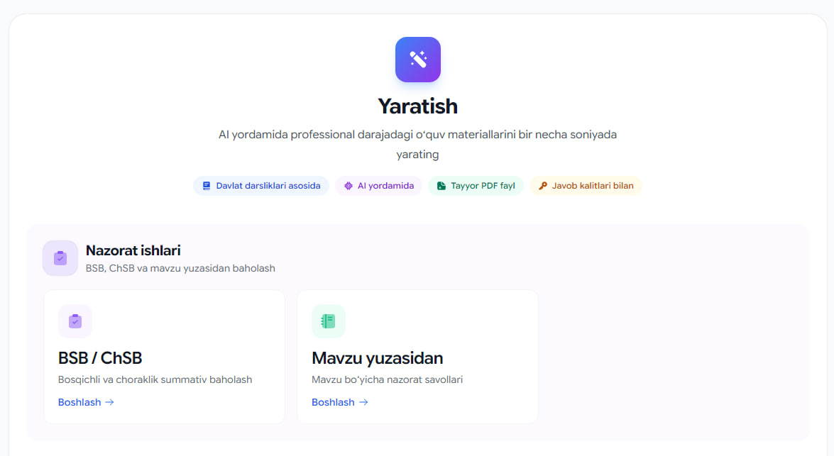 Saytimizda AI yordamida materiallar, test, CHSB va BSBlar yaratish funksiyalari eng kuchli AI tizimlari bilan integratsiyalari yangilanmoqda. Hozir savollar biroz mavzudan chetlashishi mumkin, lekin yaqin kunlarda aynan darslik asosida qiziqarli va sifatli savollar tizishni boshlaydi. Savol, taklif va g'oyalarni telegramda @iakadirov orqali yuborishingiz mumkin.